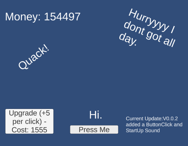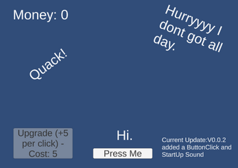 SimpleClicker is a Simple Clicker literally it only has a basic Press Me button a basic Upgrade button a Version panel (to show what version your own and what it added removed and fixed) its currently in V0.0.1 and 0.0.2 will add some extra stuff like SFX (Sounds), Saving, a Side Menu and 720P, 1080P, 1440P and 4K support so it actually looks good oh and more Upgrades